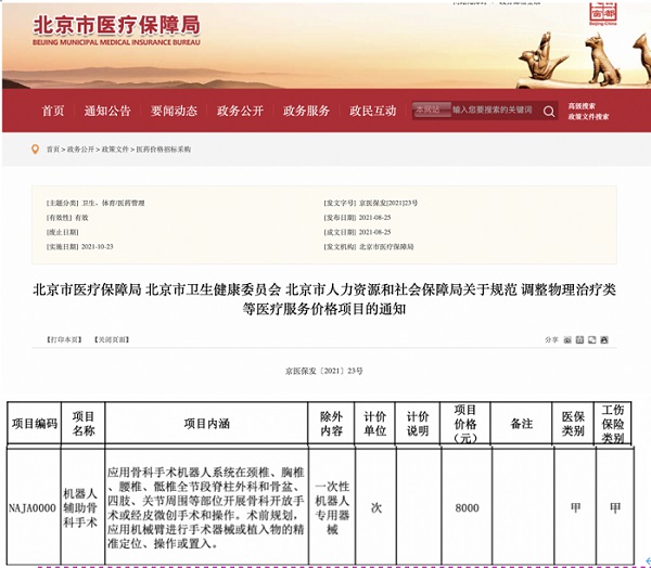 ③2021年10月23日,机器人辅助骨科手术进入北京甲类医保支付目录(可100%报销),一次性机器人专用器械获得北京乙类医保支付(可部分报销)。相关支付内容被分为两部分,一部分为机器人的使用费用,固定为8000元,可全部使用医保支付;另一部分为配套耗材费用,可部分报销。与上海方案不同的是,北京将产品范围限定为骨科手术机器人,但并未限定机器人厂商及手术类型,这让适用范围扩大了许多,更多的患者和手术机器人厂商可从中获益。