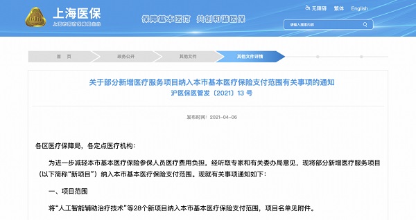 ②2021年4月20日,上海市医保局将腔镜机器人手术以“人工智能辅助治疗技术”的名称纳入乙类医保,患者自付20%,医保报销范围包括前列腺癌根治、肾部分切除、子宫全切、直肠癌根治。